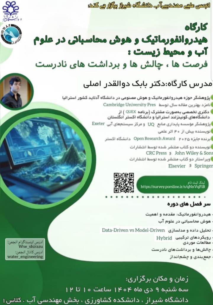 انجمن علمی مهندسی آب دانشگاه شیراز برگزار می کند: کارگاه : هیدروانفورماتیک و هوش محاسباتی در علوم آب و محیط زیست
