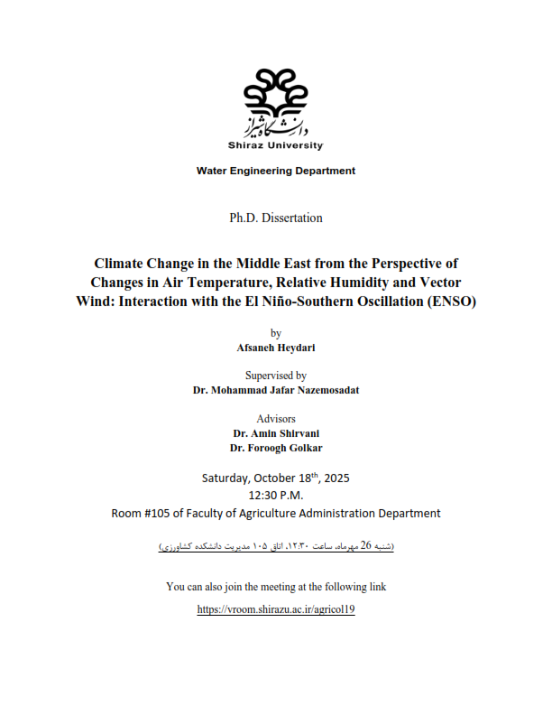 جلسه دفاع ازپایان نامه دکتری در رشته علوم ومهندسی آب- هواشناسی کشاورزی به کوشش خانم افسانه حیدری